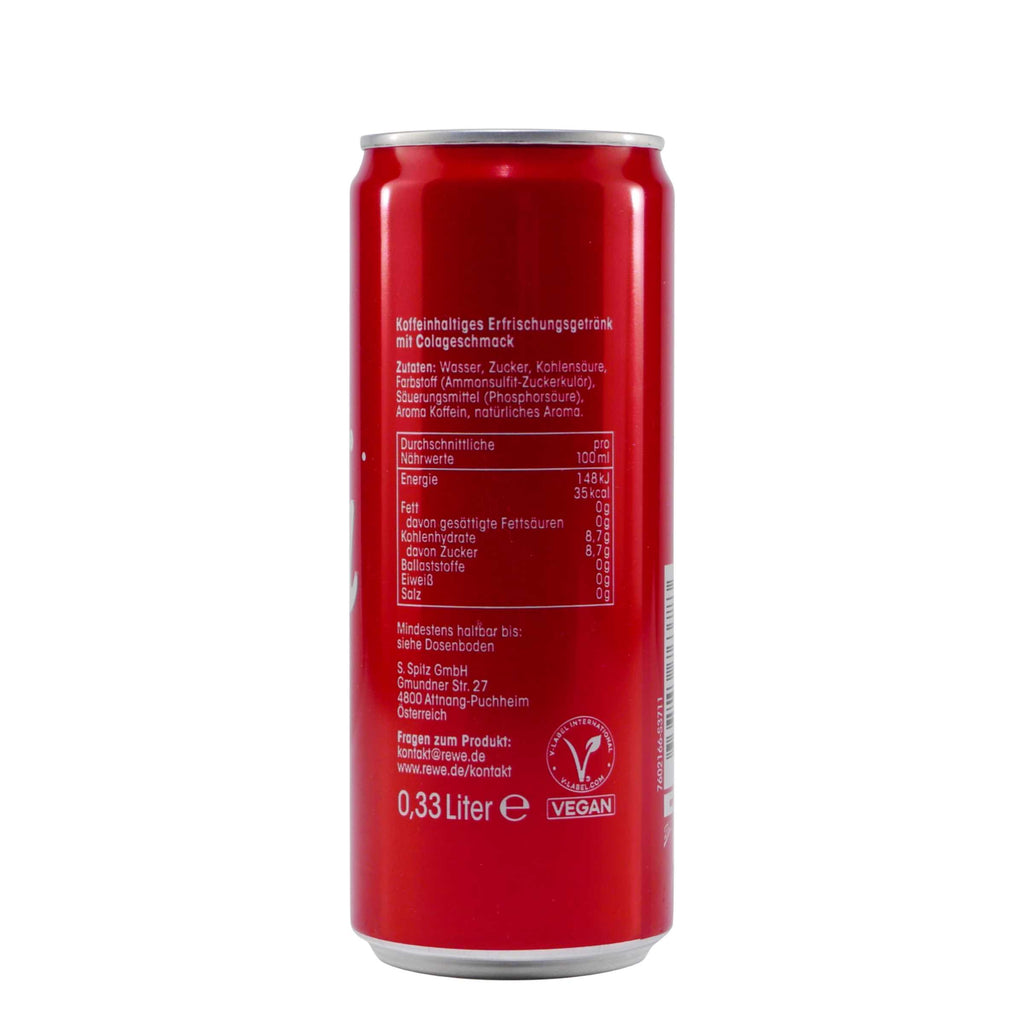 Zutaten | Wasser, Zucker, Kohlensäure, Farbstoff: Ammonsulfit-Zuckerkulör; Säuerungsmittel: Phosphorsäure; Aroma Koffein, natürliches Aroma |