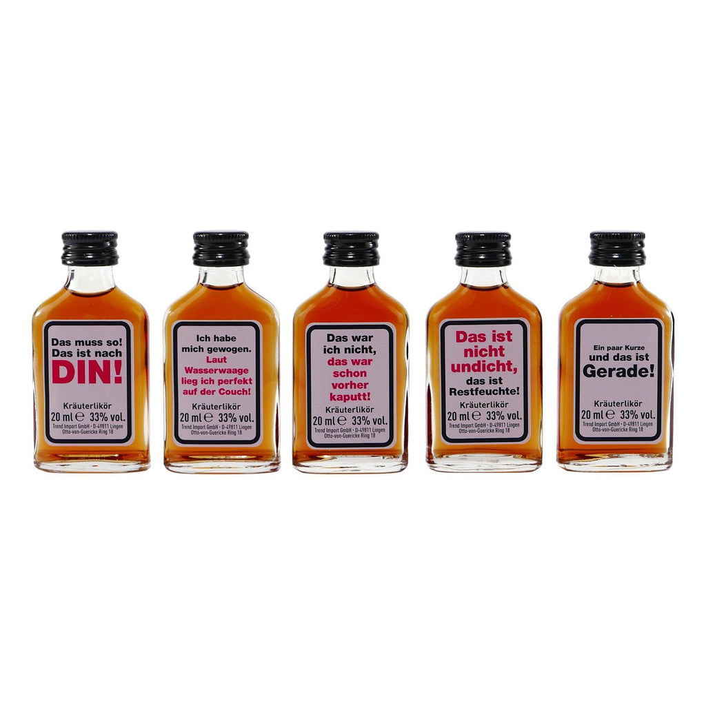 Die Partywaage Kräuterlikör Kollektion, bestehend aus fünf handlichen Fläschchen à 0,02 Liter, verspricht unvergessliche Genussmomente in der Wasserwaagen-Geschenkverpackung. Diese erlesenen Kräuterliköre sind die perfekte Wahl für jeden Anlass. Ideal als edles Geschenk für Handwerker.