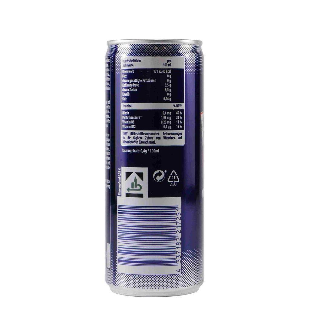 | Zutaten | Wasser, Zucker, Säuerungsmittel: Citronensäure; Kohlensäure, Taurin (0,4%), Säureregulator: Natriumcitrate; Koffein (0,03%), Farbstoff: Zuckerkulör; Aroma, Vitamine: Niacin, Pantothensäure, Vitamin B6, Vitamin B12 |